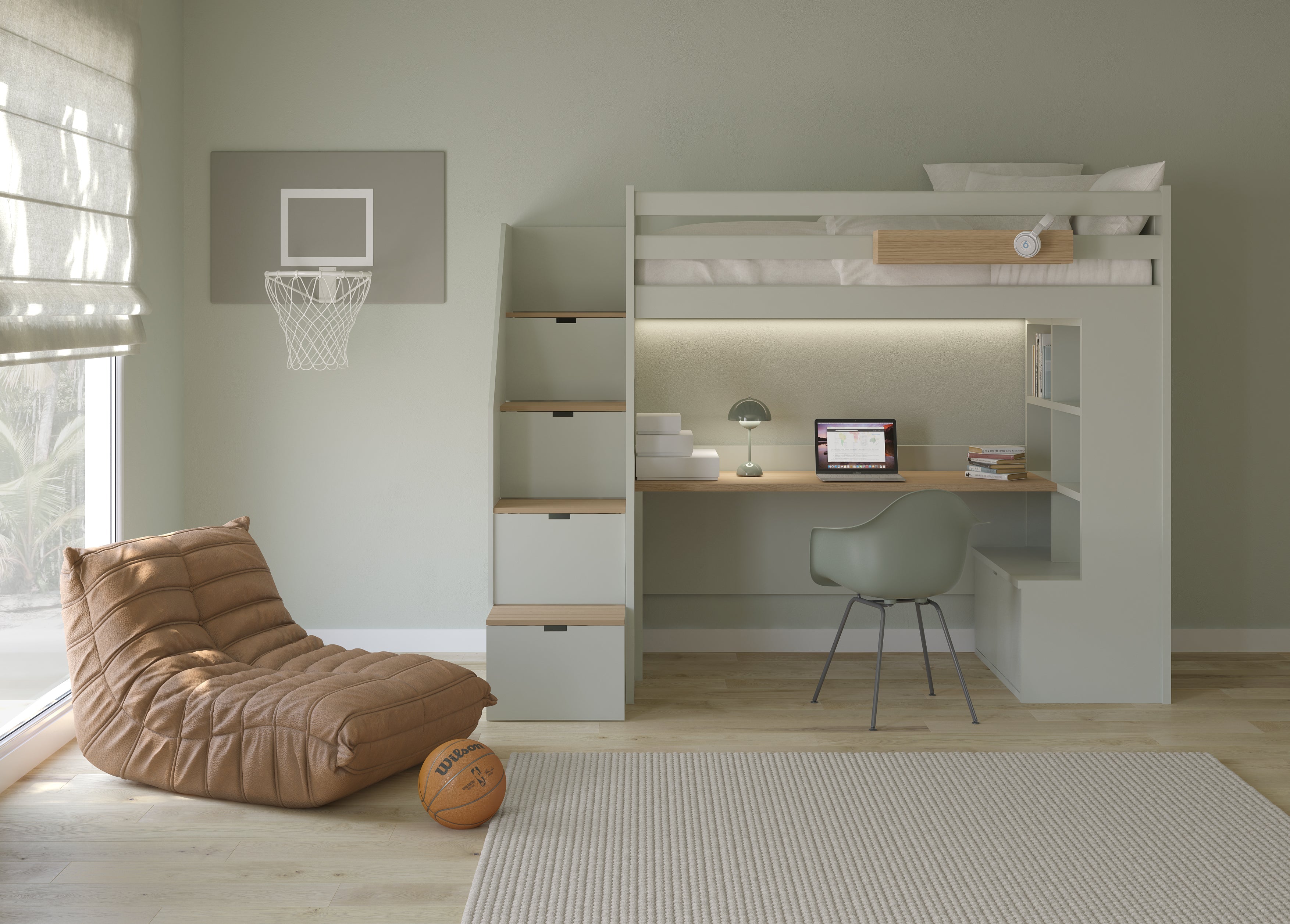This loft bed is more than just a place to sleep — it's a multifunctional space that adapts to your child's needs. Whether it's homework, reading, or storing toys, everything has its place. The combination of form and function ensures that your child's room remains organised and stylish.