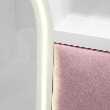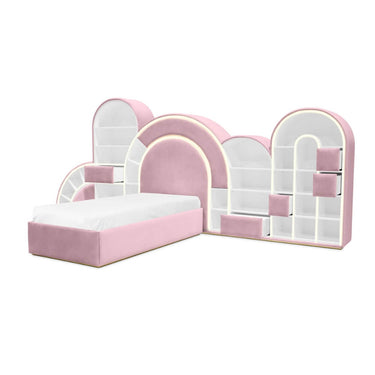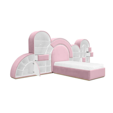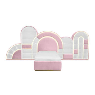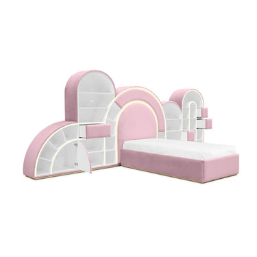 The Bubble Gum Bed features a sculptural curved headboard with integrated LED lighting, adding a magical glow that sets the tone for storytime or a cozy night in. Crafted from glossy lacquered wood and upholstered in plush velvet, it’s finished with elegant gold leaf detailing, bringing a sense of playfulness wrapped in high-end design.