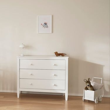 The Isle of Dogs Design 3 Drawer Chest of Drawers in White is where form meets function — a beautifully made piece of furniture designed to bring both style and practicality to your child’s room.