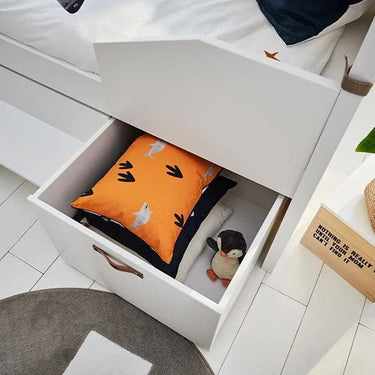 Below the cabin bed there is space for 3 of these big storage boxes. The cool leather handles are included, how cool. To fill the space below the bed, you can place up to 3 of these drawers, then also add 2x guidance for the drawers, art. 4211, when placed more then 1 drawer.