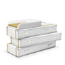 Crafted in a high-gloss white lacquered finish and adorned with gold and white synthetic leather accents, it makes a stylish statement while offering superb functionality. The unit features three spacious drawers for essential baby items, and a comfortable, easy-to-clean changing pad on top, complete with a separate container for storing creams, wipes, and other necessities.
