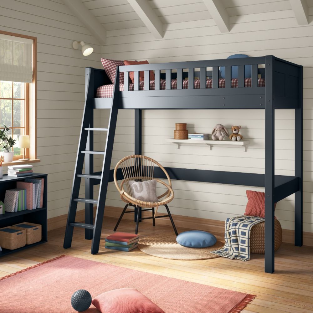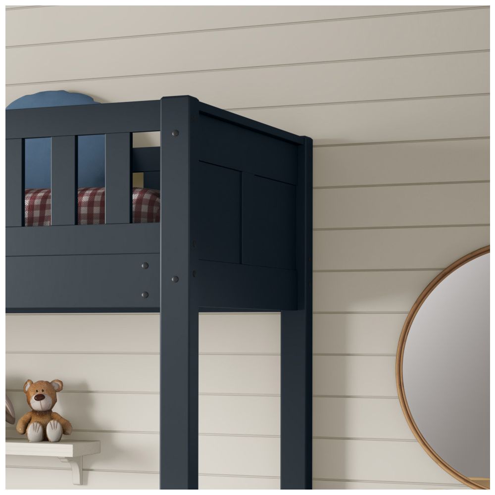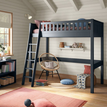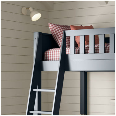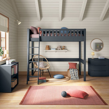 The Arven High Sleeper in Heritage Blue is designed to create space for sleeping, studying, and relaxing - all within a beautifully considered footprint. By elevating the sleeping area, this high sleeper opens up valuable floor space beneath, giving families the flexibility to add a study zone, storage solution, or cosy retreat. A slanted ladder ensures a comfortable, natural climb, while the warm Heritage Blue finish and clean panelled detailing reflect timeless Scandinavian design.