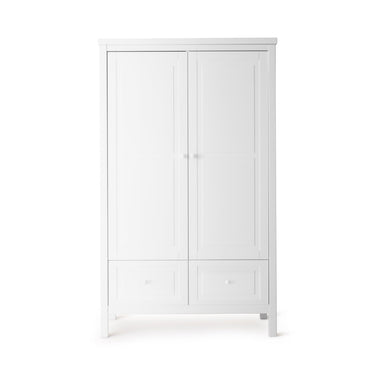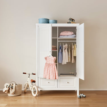 Expertly crafted from solid, certified beech wood sourced from sustainable forestry, the wardrobe features a smooth white lacquered finish that enhances its clean, timeless look. Two soft-closing doors with high-quality hinges ensure gentle, near-silent operation — ideal for quiet environments. The ergonomically shaped wooden handles, designed for smaller hands, make it easy and comfortable for children to use independently.