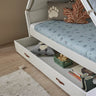 A functional bed drawer which can be used below the single bed. The cool leather handles are included, how cool.