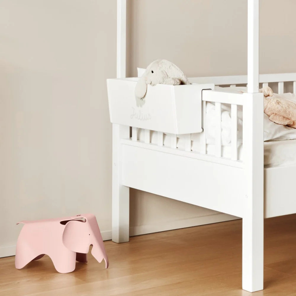 The clever clip-on design allows the box to be easily and securely attached to couch, bunk, or play beds, offering convenient storage without taking up floor space. Its sturdy beech wood construction and smooth white lacquer finish ensure lasting quality, while rounded corners and a child-friendly design provide added safety for everyday use.
