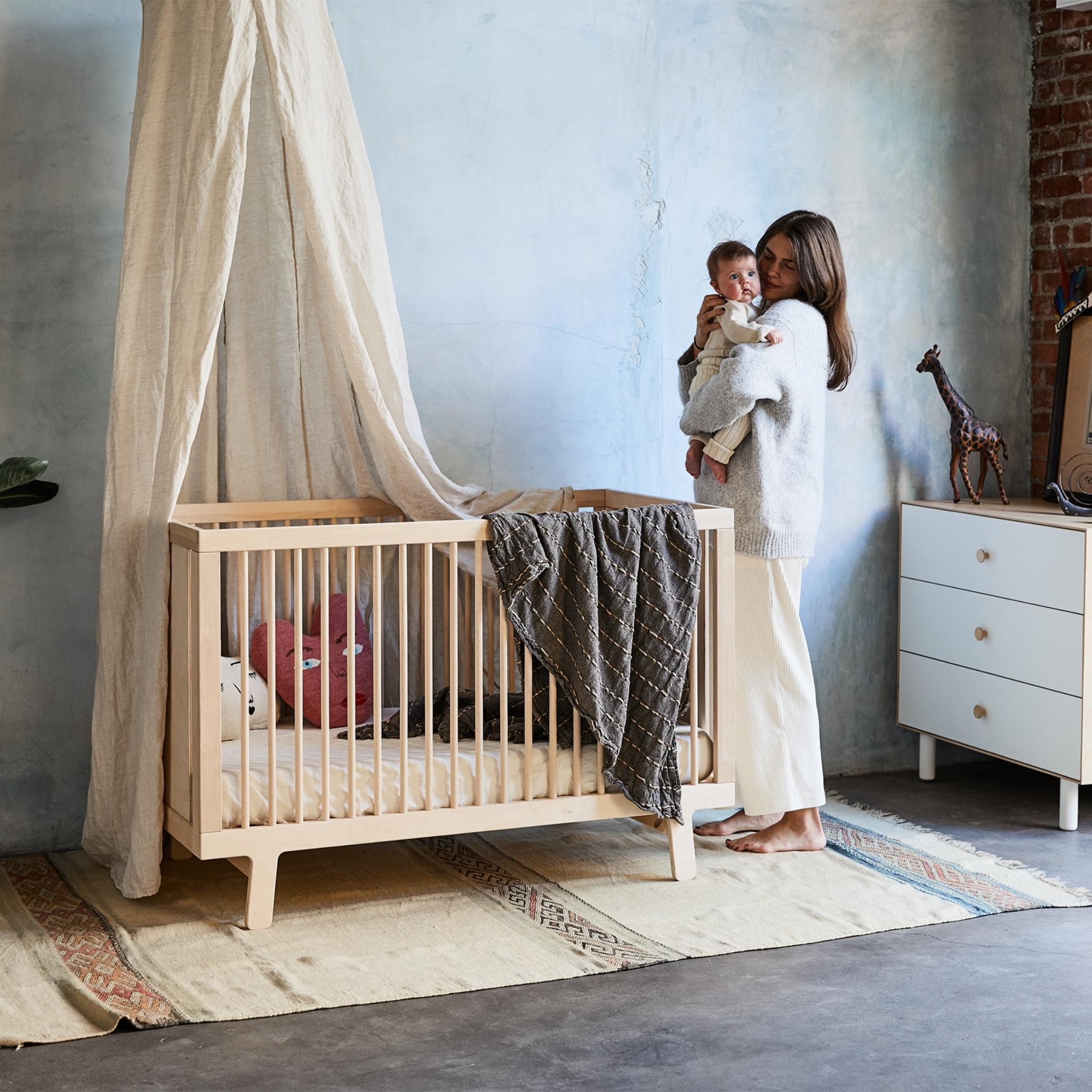 Oeuf NYC's Sparrow Cot Bed is set apart by its distinctive design and exceptionally durable birch-hardwood construction. Featuring three adjustable mattress heights, the Cot Bed adapts to your baby's changing needs, ensuring a supportive and comfortable sleeping experience.